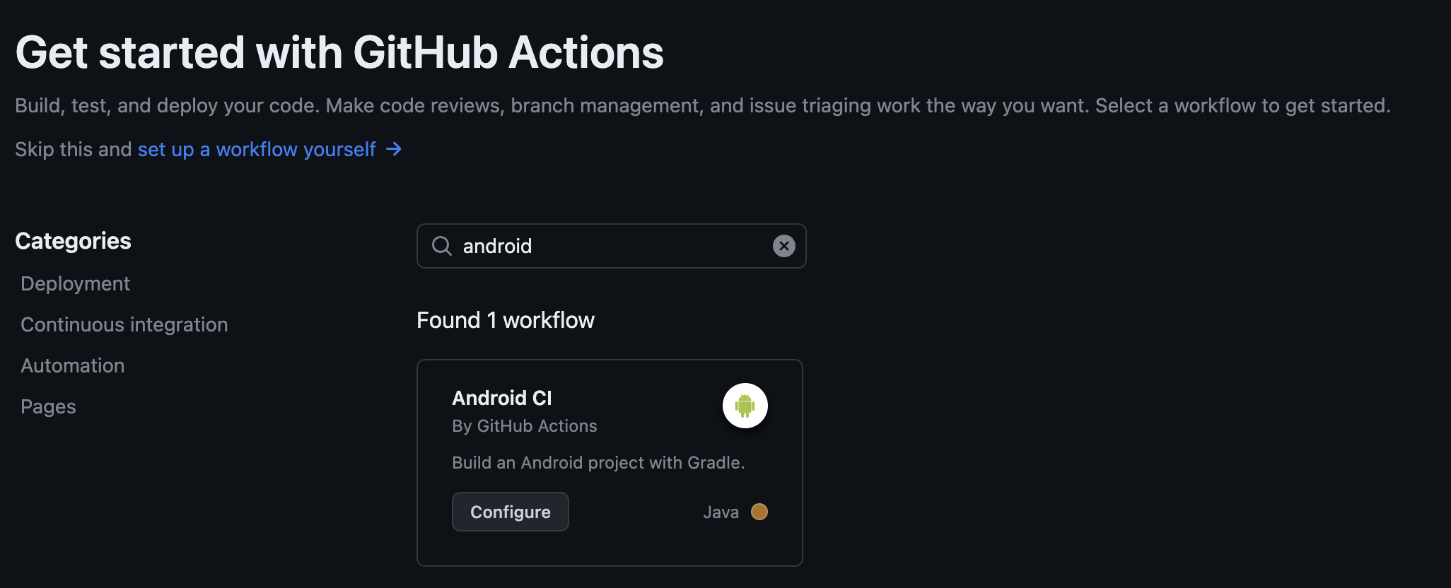 깃헙 액션을 선택 후 new workflow를 선택했을 때 선택 영역이 나타납니다. 저는 "android"를 검색하여 Android CI를 선택하여 베이스를 생성합니다.