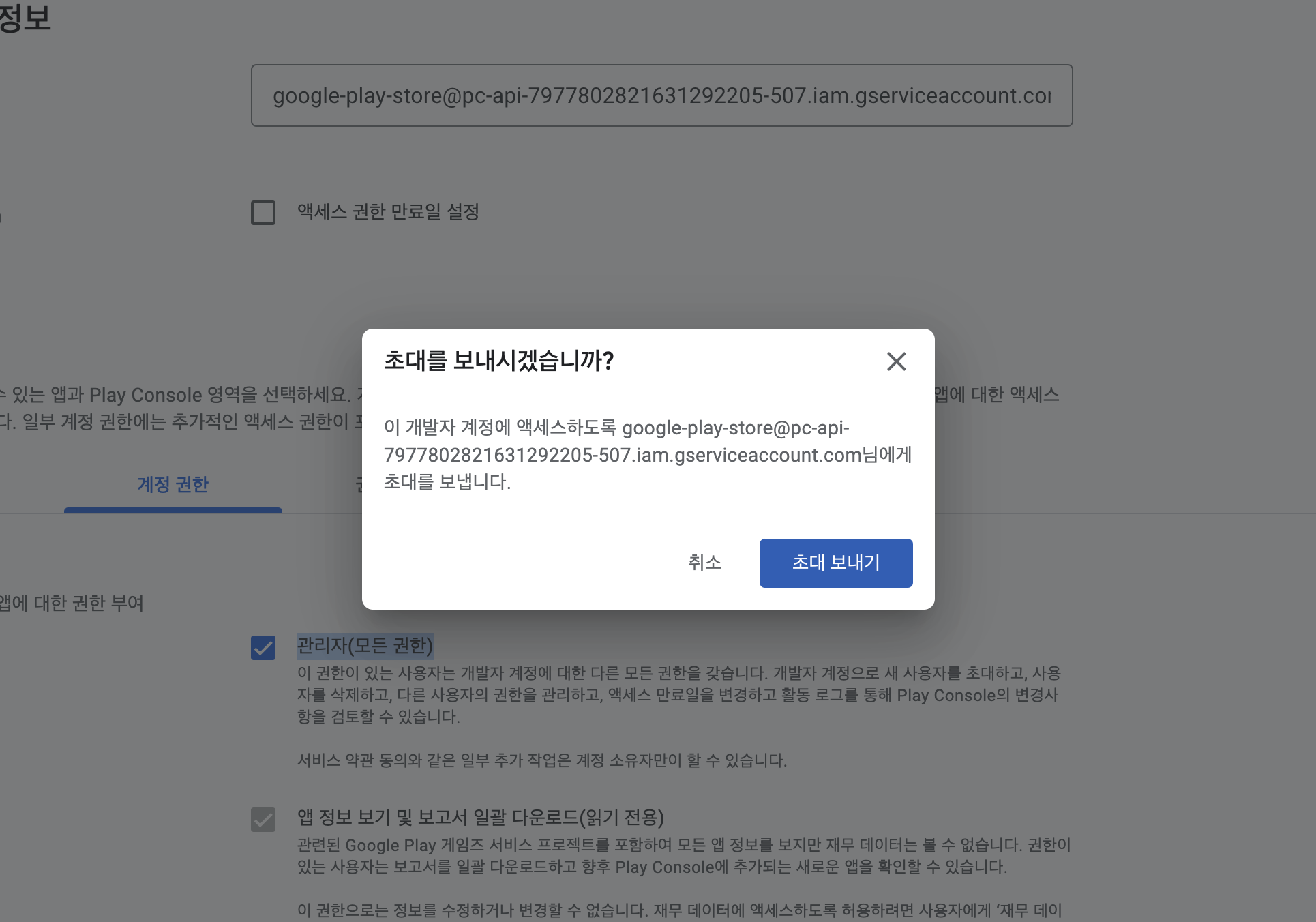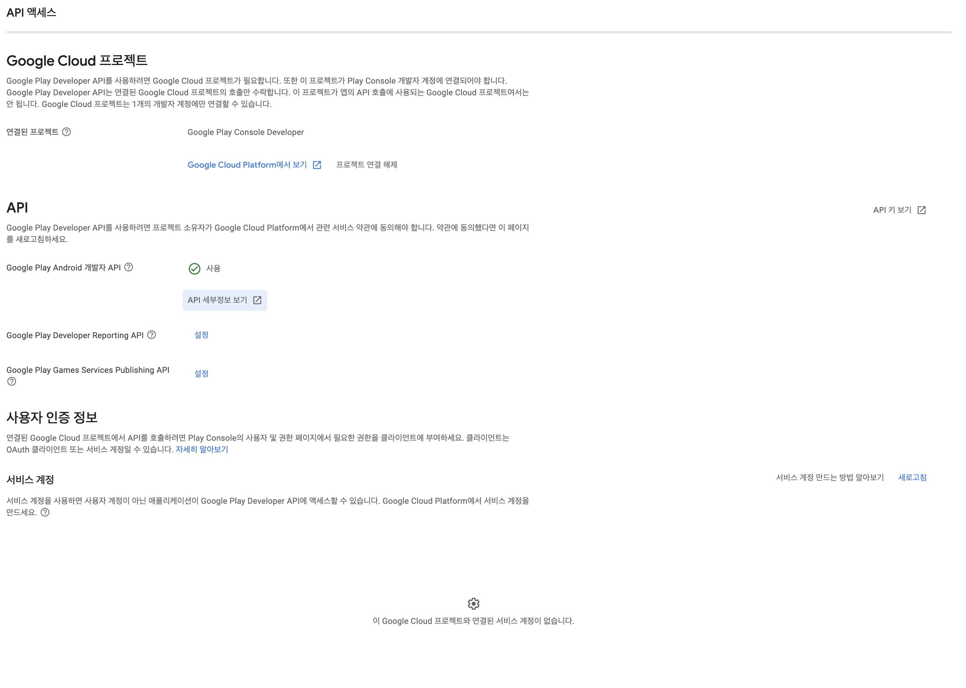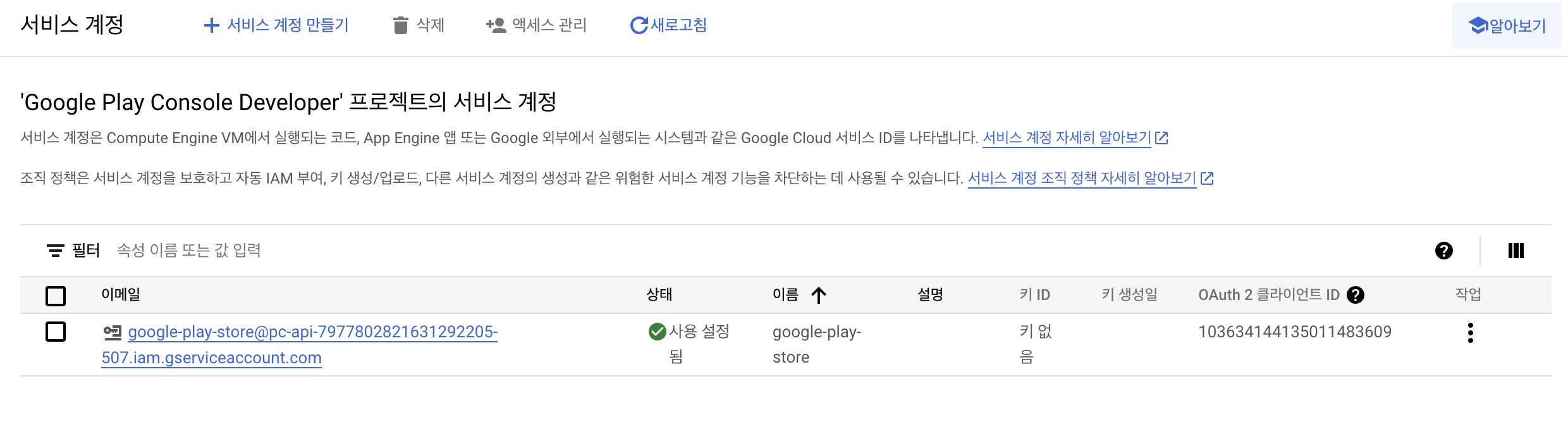다시 play store로 이동하여 API 액세스 영역을 가면 아래의 이미지와 같이 서비스 계정이 표시가 됩니다.