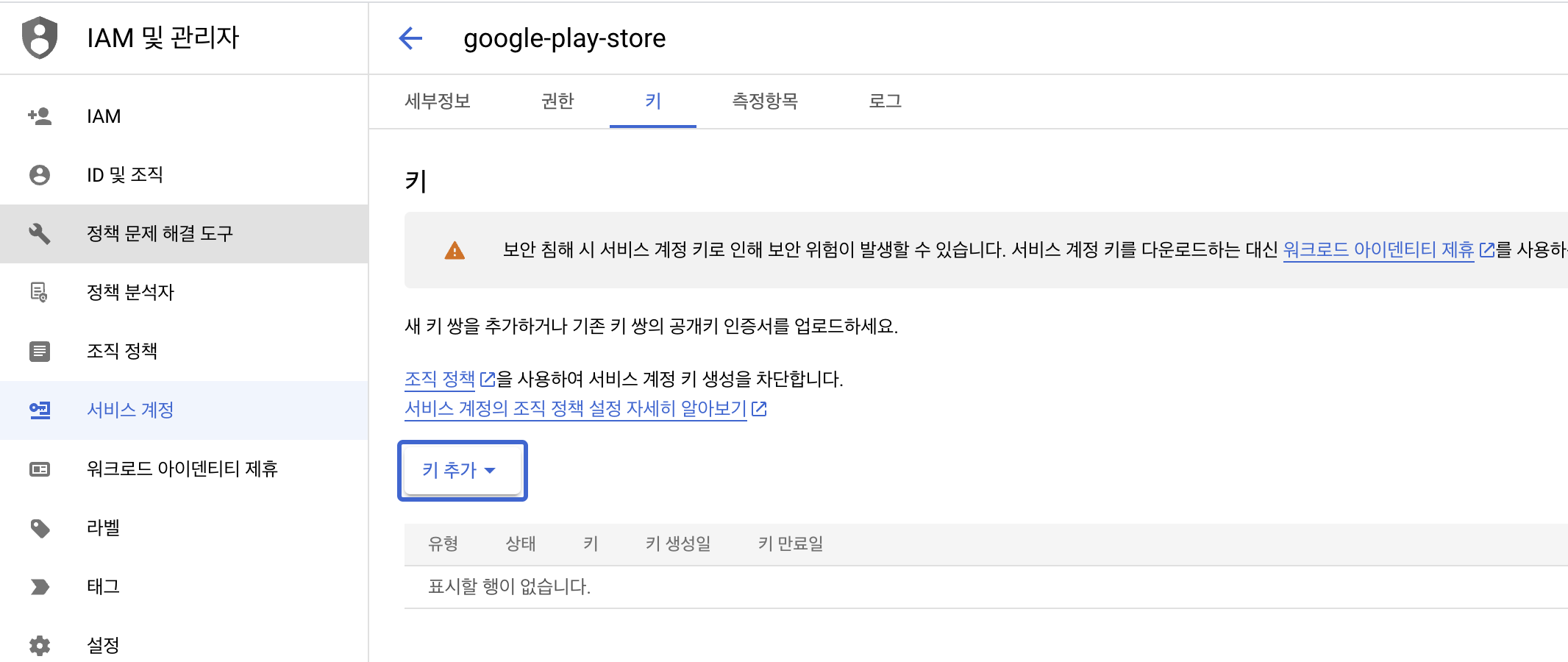 서비스 계정 키 생성 및 삭제 | IAM 문서 | Google Cloud