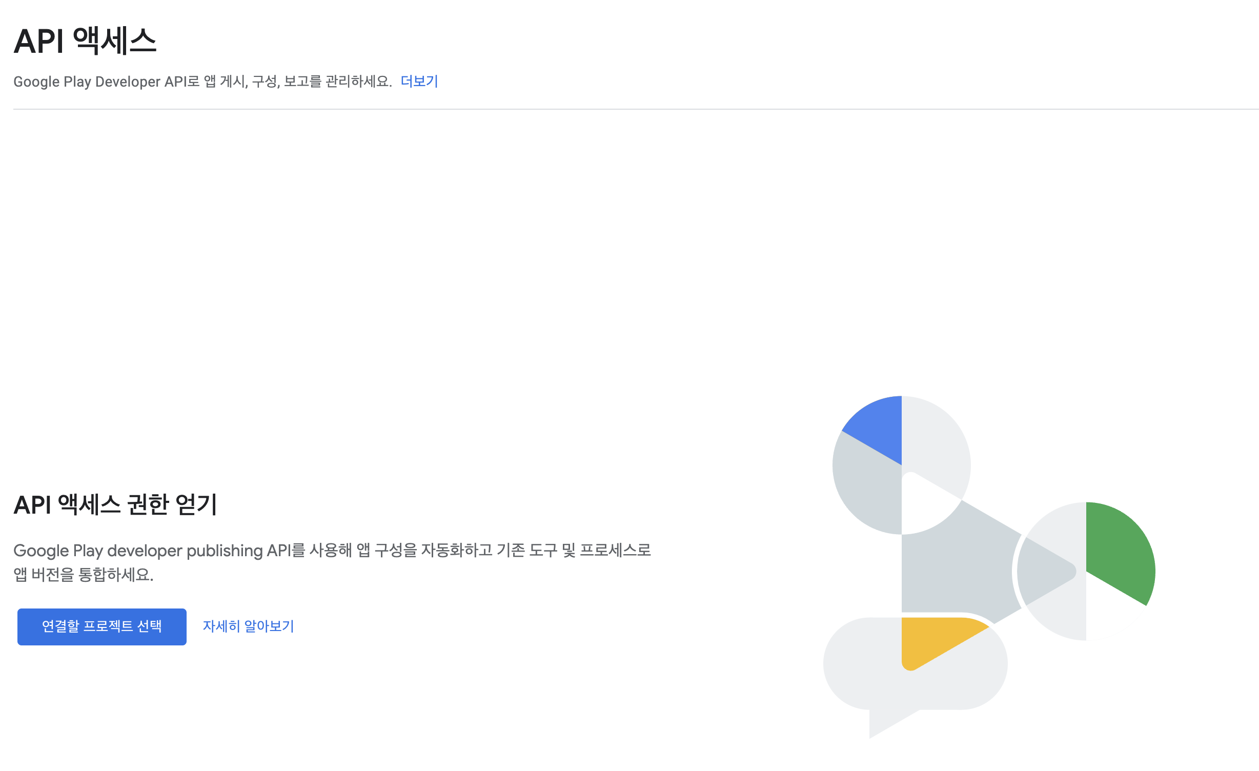 해당하는 프로젝트에서 설정 -> API 액세스 선택합니다. (선택 후 오른쪽 이미지와 동일하게 표시 됩니다.) 연결할 프로젝트 선택 합니다.