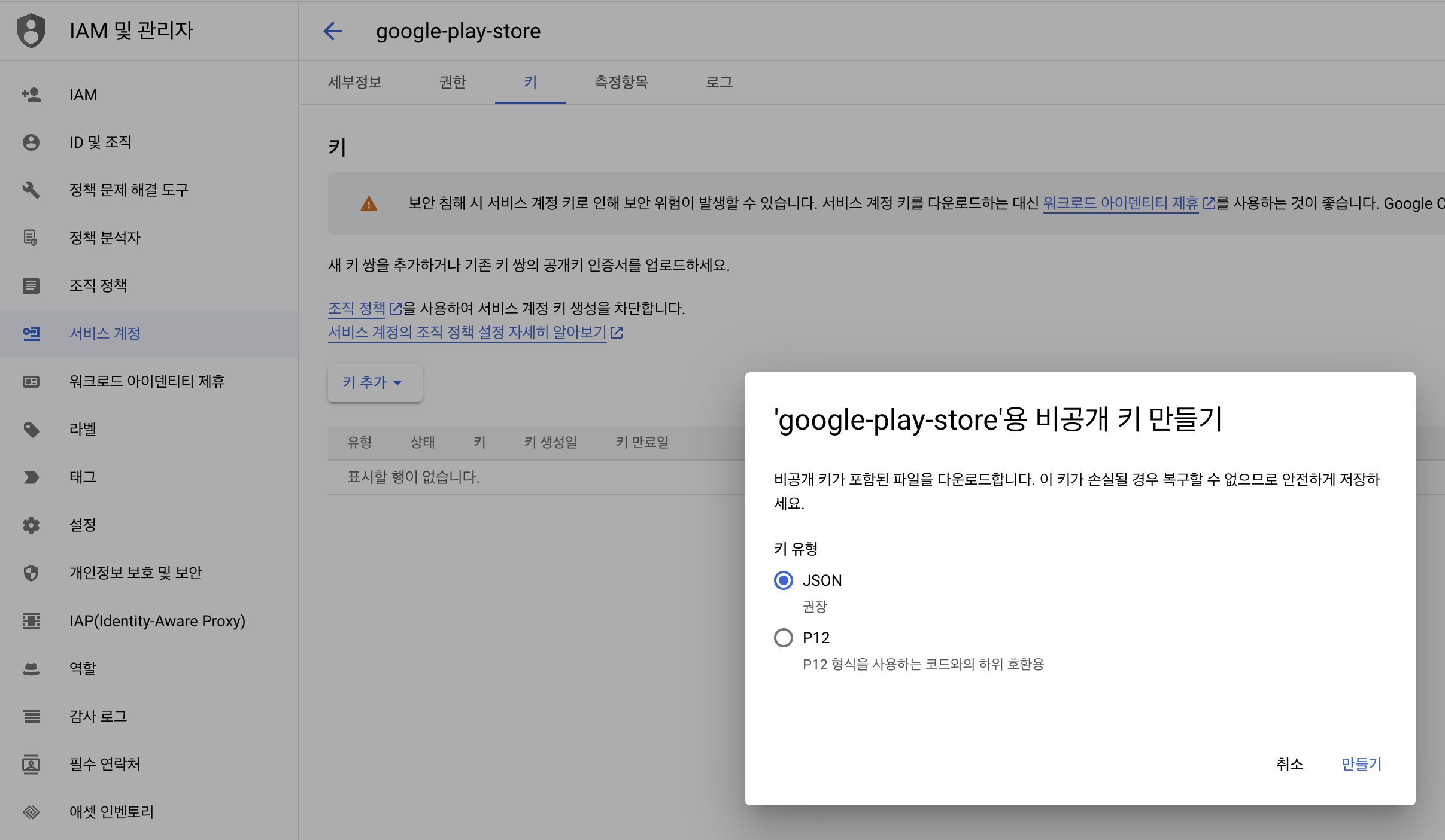이미지와 같이 키 유형을 선택하고 (JSON추천) 만들기를 선택합니다.