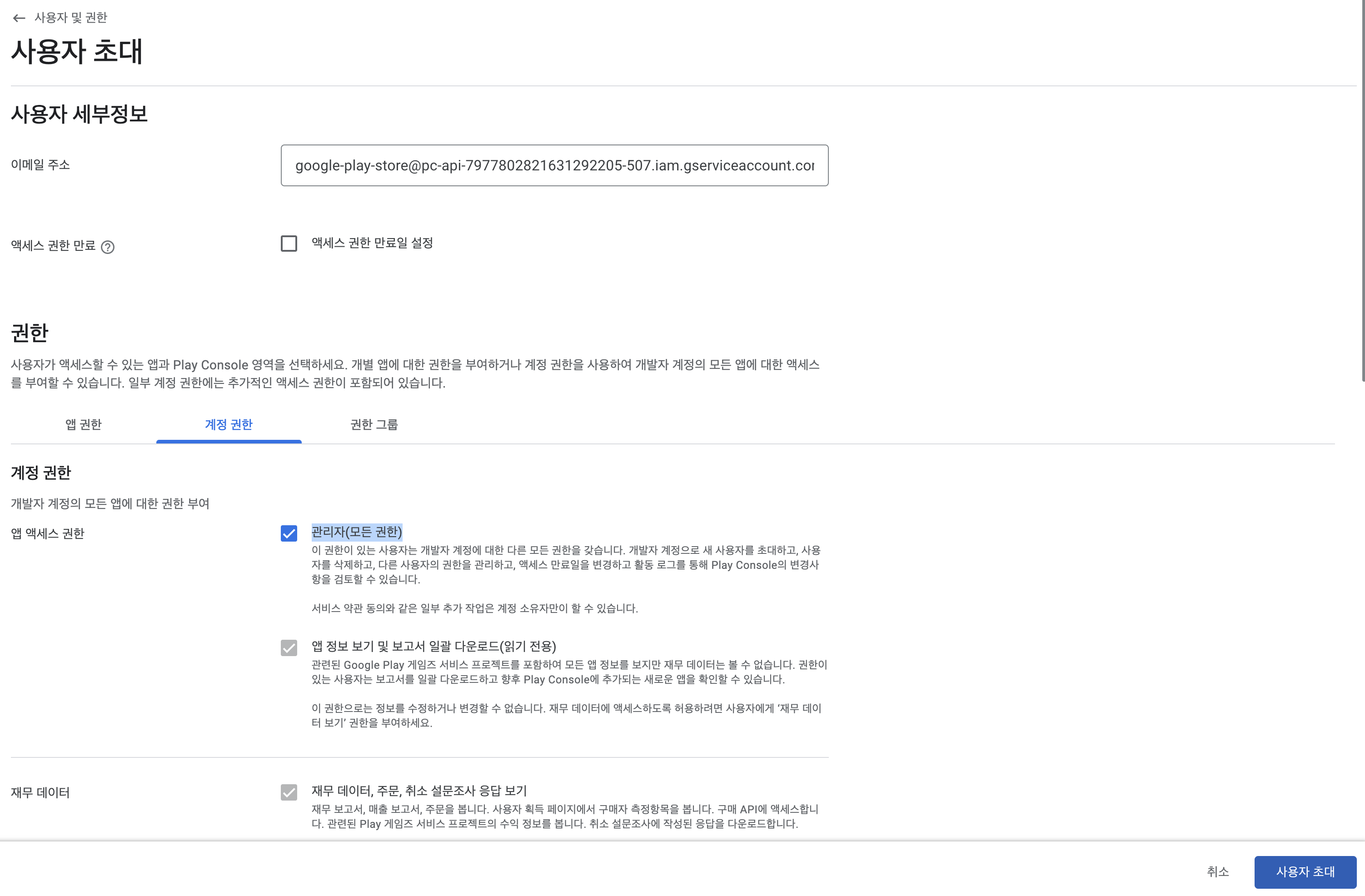 필요한 권한을 부여한 후 오른쪽 아래 사용자 초대를 눌러주세요