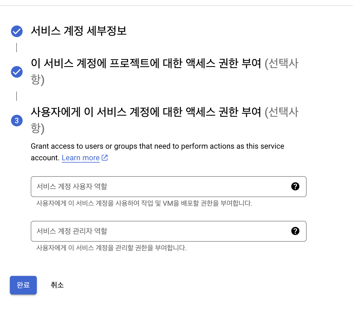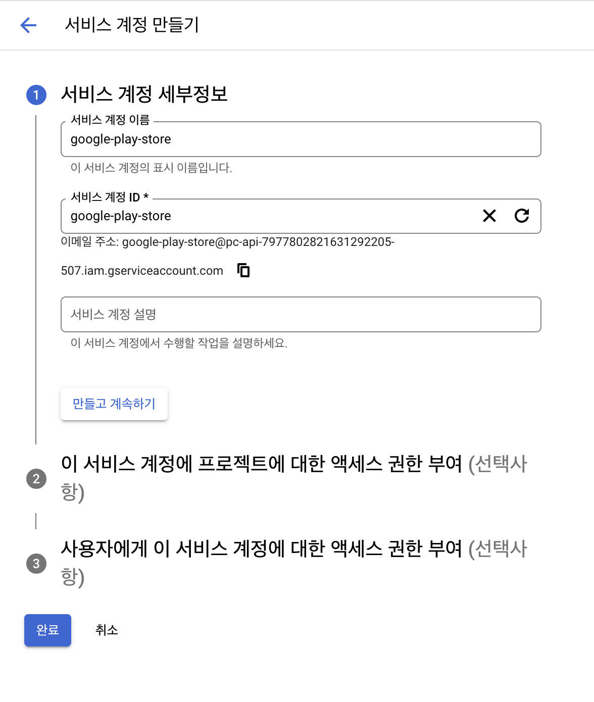 서비스 계정 이름 작성합니다. 작성이 진행되면 아래 서비스 계정 ID가 자동으로 작성되며, 만들고 계속하기를 선택합니다.
