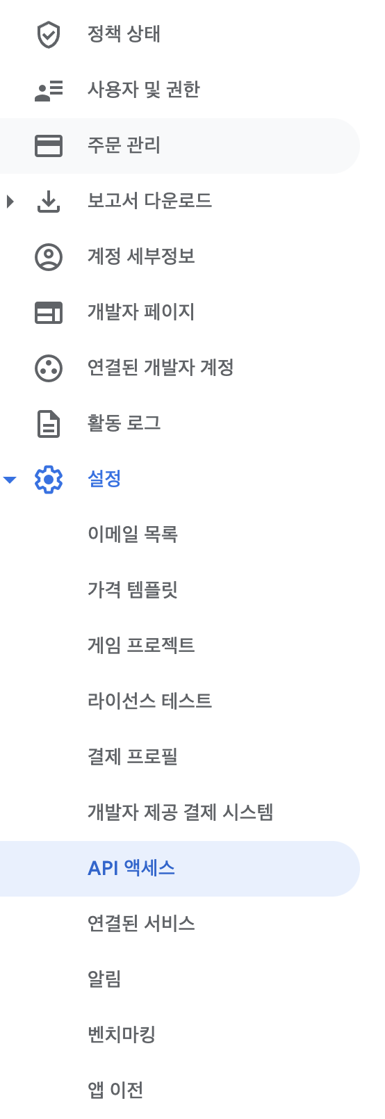 오른쪽 Play Console 권한 관리를 선택해 주세요.