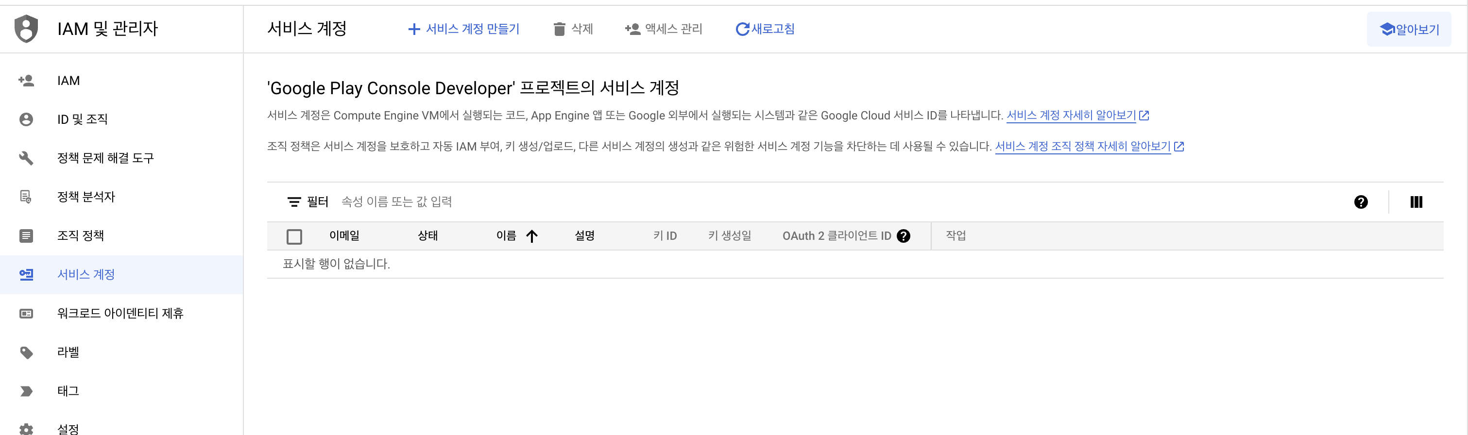 신규로 만들었을 경우 서비스 계정이 하나도 없을 것으로 판단되며 +서비스 계정 만들기를 선택합니다.